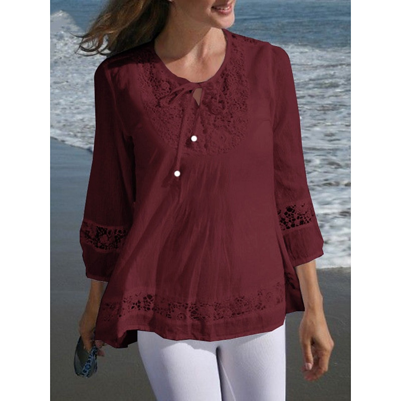 Women's Blouse Solid Color Stylish Casual 3/4 Length Sleeve Crew Neck Regular Tops Daily Lace Patchwork Black White Wine Navy Blue Summer Spring Fall