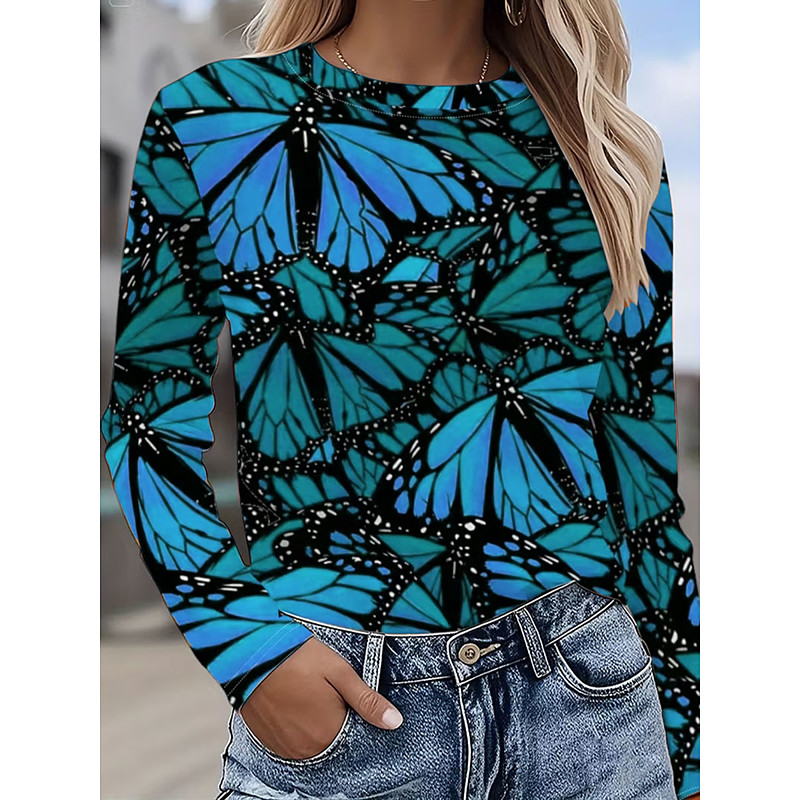 Women's T Shirt Graphic Butterfly Vintage Fashion Stylish Long Sleeve Crew Neck Round Neck Regular Tops Daily Weekend Print Blue Purple Orange Green Summer Spring Fall