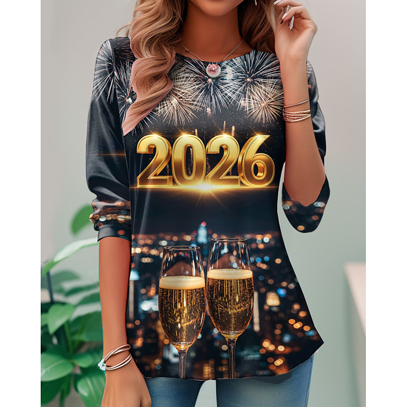 New Year Women's T Shirt Graphic Geometric Vintage Stylish Classic Long Sleeve Crew Neck Regular Tops Daily Weekend Print Black Pink Gold Spring Fall Winter