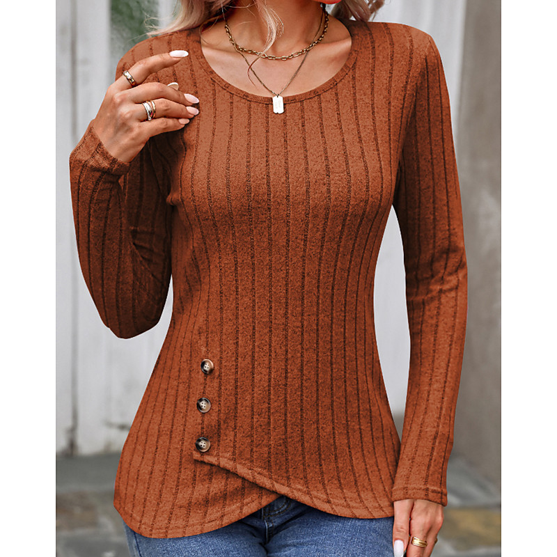 Women's T Shirt Solid Color Casual Long Sleeve Crew Neck Regular Tops Going out Weekend Buttons Black Dusty Blue Brown off-white Rose Pink Fall Winter