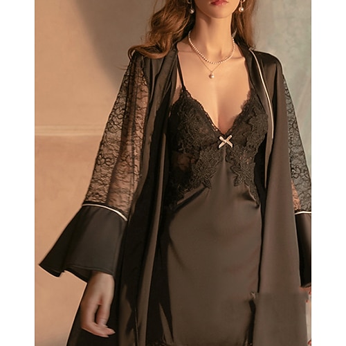Per donna Pigiama Accappatoio Casual Morbido Raso Colore Puro Pizzo Quotidiano Casa Da letto Senza Maniche Spalline Nero Bianco Vino Oro Grigio scuro Estate Vestibilità comoda