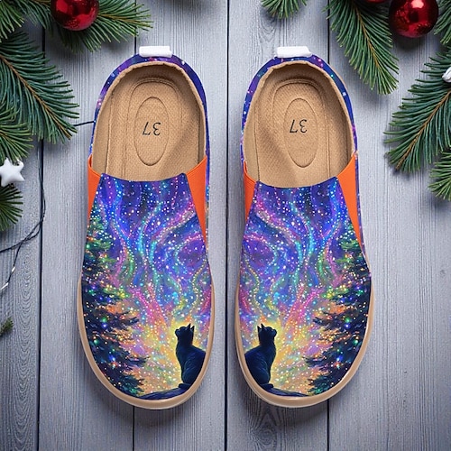 Sneakers da donna rosse a forma di gatto natalizio con dettagli a fiocco di neve: slip-on festive per le calde giornate invernali, le riunioni di festa e l'abbigliamento casual