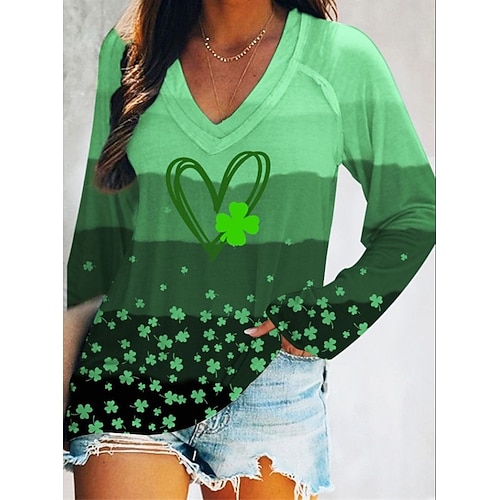 Maglietta da donna per il giorno di San Patrizio grafica trifoglio elegante alla moda classico manica lunga colletto a V tops regolari quotidiana uscita nel fine settimana stampa verde primavera