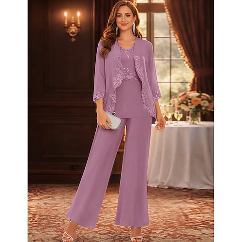 Completo pantaloni lunghezza pavimento abito madre della sposa manica lunga collo a giro elegante semplice invitato al matrimonio con colore solido
