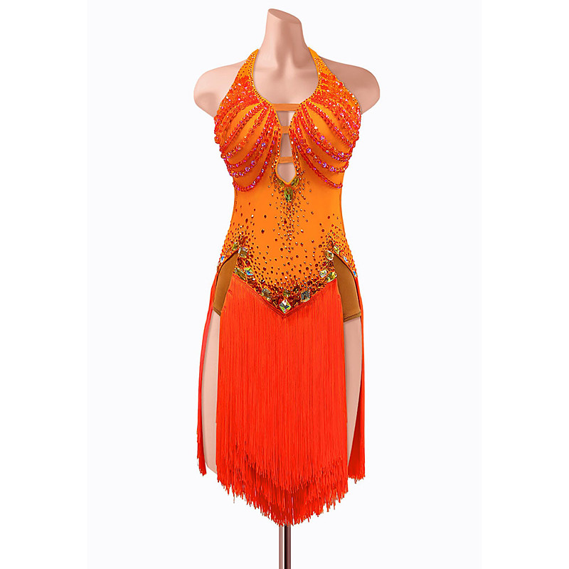 Women's Orange Yellow Rhinestone Fringe Latin Dance Dress - Halter Neck Cutout Asymmetrical Ballroom Performance Costume