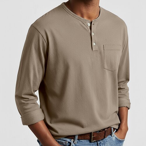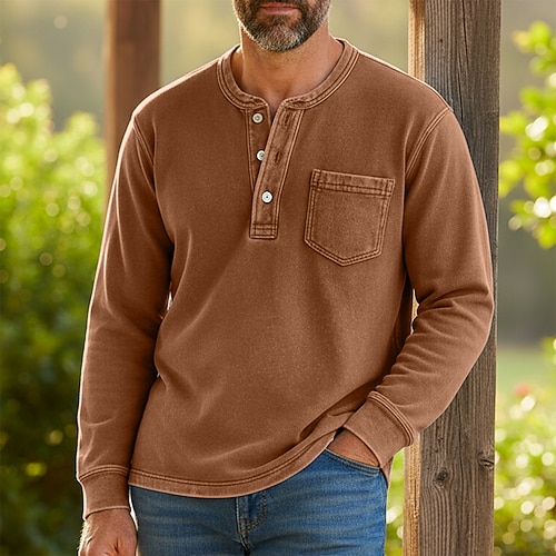 Per uomo Maglia Henley Camicia 100% cotone lavaggio acido Maglietta Manica Lunga Semplice Vintage Retrò Vintage Casual Stile Vintage Lavato Henley Casuale Primavera Autunno Autunno Inverno Marrone