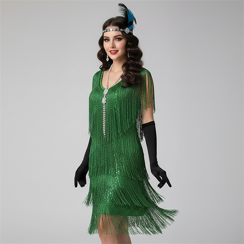 Set Retro Vintage 1920s Mini Short Length Flapper Dress Dress Outfits with Accessories Sleeveless The Great Gatsby Wedding Guest Tassel Fringe Solid Colored Tassel V Neck Fancy Dress Women's