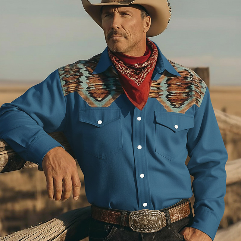 Men's Aztec Geometric Pattern Ethnic Shirt Western Shirt Cowboy Shirt Long Sleeve Vintage Retro Outdoor Casual WorkWear Spring Fall Turndown Front Two Pockets Linen Like Shirt Button Up Shirts Blue