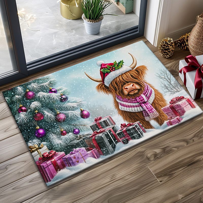 Christmas Decoration Doormat Xmas Highland Cattle Kitchen Mat Floor Mat Non-Slip Area Rug Oil Proof Rug Indoor Outdoor Mat Bedroom Decor Bathroom Mat Entrance Rug