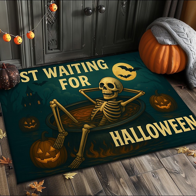 Halloween Indoor Outdoor Doormat Kitchen Mat Funny Skeleton Waiting for Halloween, Non-Slip Front Door Mat for Porch, Entryway, Patio, Bedroom, Bathroom and 2025 Halloween Home Decoration