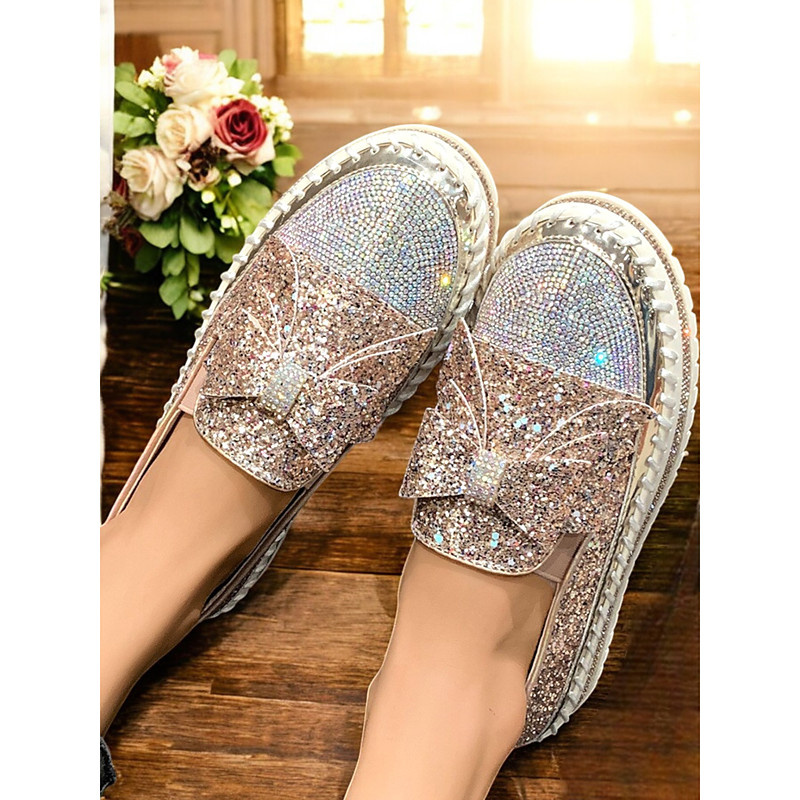 Glitter Bridal After Party Shoes for Bride, Sparkly Bow Slip-On Wedding Reception Flats