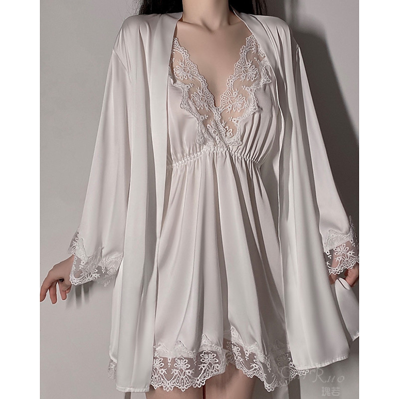 Women's Robe Nightgown Pajama Set Casual Soft Satin Pure Color Lace Dress Daily Home Bed Long Sleeve Straps Black White Pink Wine Brown Summer Regular Fit