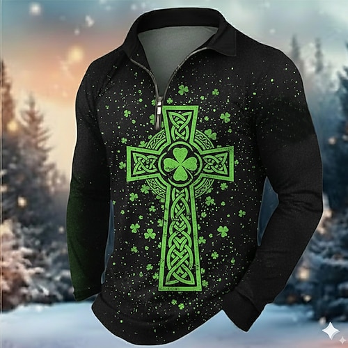 San Patrizio Per uomo Trifoglio Polo Manica Lunga Collo ripiegato Moderno Tempo libero Athleisure Casual Quotidiano Festival Cerniera Stampa 3D Primavera Autunno Nero Bianco Verde