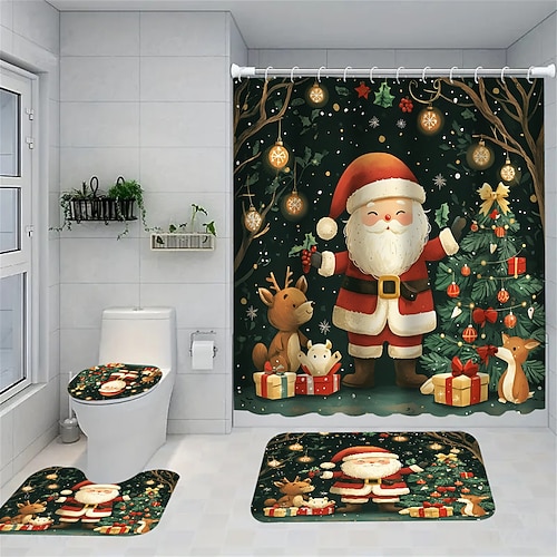 Tenda da doccia in quattro pezzi, con sedile del water antiscivolo e robusto e tappetino da bagno, motivo natalizio con Babbo Natale e albero di Natale, materiale in poliestere impermeabile con 12