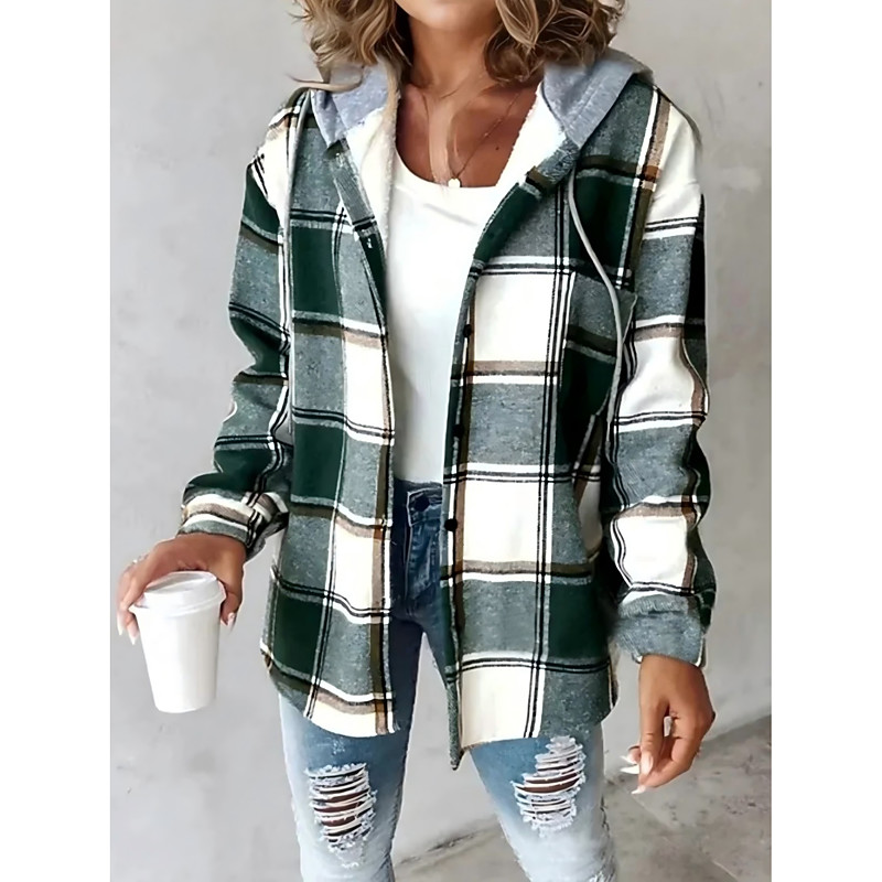 Women's Shirt Graphic Plaid Vintage Tropical Stylish Long Sleeve Hooded Regular Tops Work Daily Holiday Buttons White Light Brown Brown Green Light Grey Spring Fall Winter