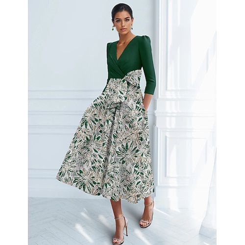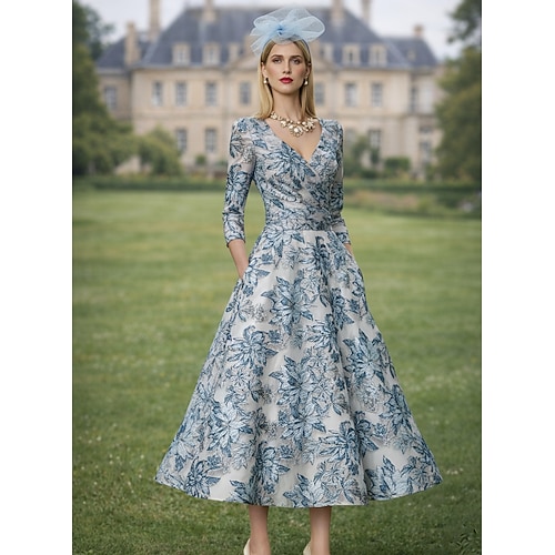 Linea ad A Lunghezza Tè Vestito da Festa Abito da Cocktail Abito da invitata a nozze Abito da cerimonia per signora Manica 3/4 Scollo a V Elegante Vintage Formale Derby del Kentucky Semi-Formale