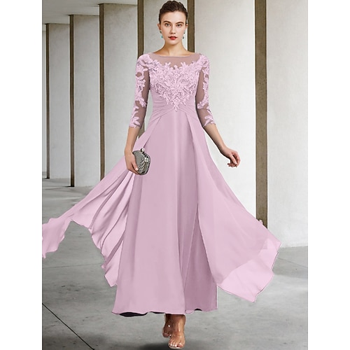 Linea ad A Lunghezza alla caviglia Vestito da Festa Abito da Cocktail Abito da invitata a nozze Abito da cerimonia per signora Manica 3/4 Collo gioiello Elegante Ospite di nozze Chiffon Pizzo con