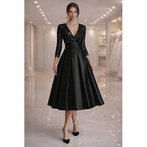 Linea ad A Lunghezza Tè Abiti da Cocktail Abiti da festa Elegante Vintage Taglie Forti Manica 3/4 Scollo a V Ospite di nozze Raso con Pieghe
