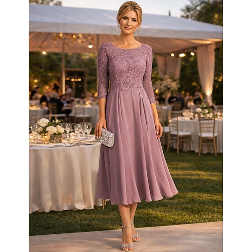 Linea ad A Lunghezza Tè Vestito da Festa Abito da Cocktail Abito da invitata a nozze Abito da cerimonia per signora Manica 3/4 Girocollo Elegante Ospite di nozze Festa di fidanzamento Chiffon con