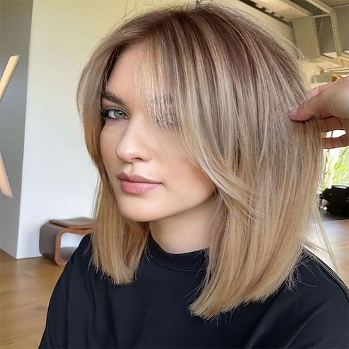 Mittellange glatte blonde Bob-Perücke für Damen mit dunklem Ansatz – hitzebeständiges Kunsthaar für Cosplay, Halloween Alltagskleidung