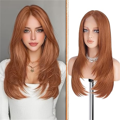 Braunblonde Perücke mit Curtain Bangs – Lace-Front-Haaransatz, Mittelscheitel, lange gestufte, natürlich wirkende, glatte Kunsthaarperücke für Damen, ideal für Alltag und Partys, 61 cm (24 Zoll),
