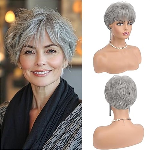 Graue Pixie-Perücken für Damen – kurzer, natürlich gestufter Haarschnitt, hitzebeständige Kunsthaarperücke für den Alltag, grau-schwarz gemischt