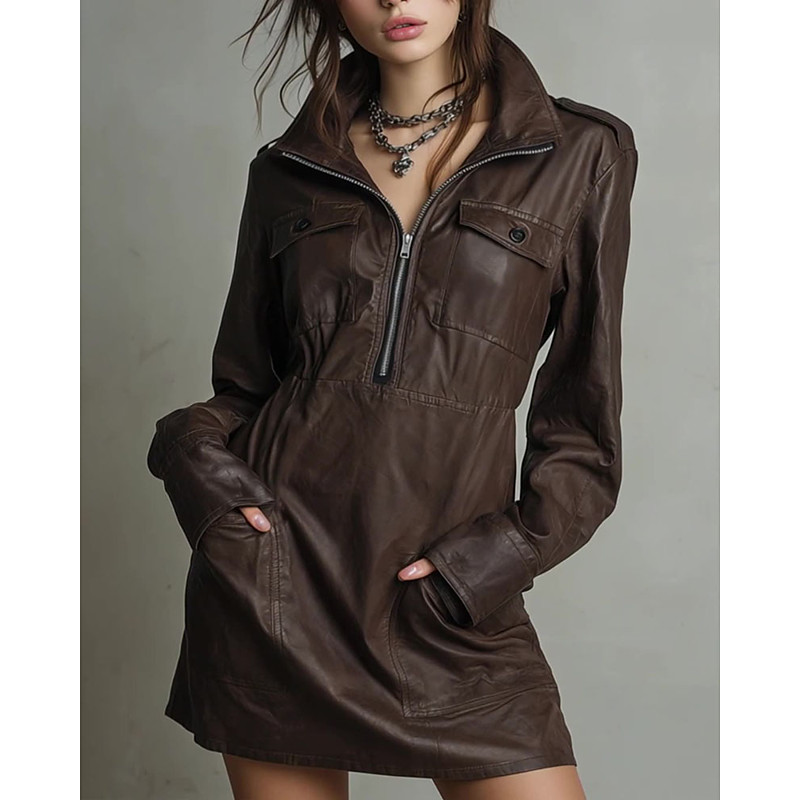 Women's Mini Dress Leather Dress Fashion Modern Daily Office Vacation Regular Fit Houndstooth Plain Long Sleeve Shirt Collar Camel Spring Fall Winter