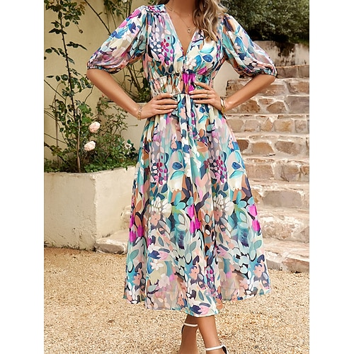 Per donna Abito Midi Abito a trapezio Vacanza Casual All'aperto Uscire Vestibilità regolare Floreale Manica Corta Scollo a V Blu Nero Verde chiaro Rosso Estate Primavera
