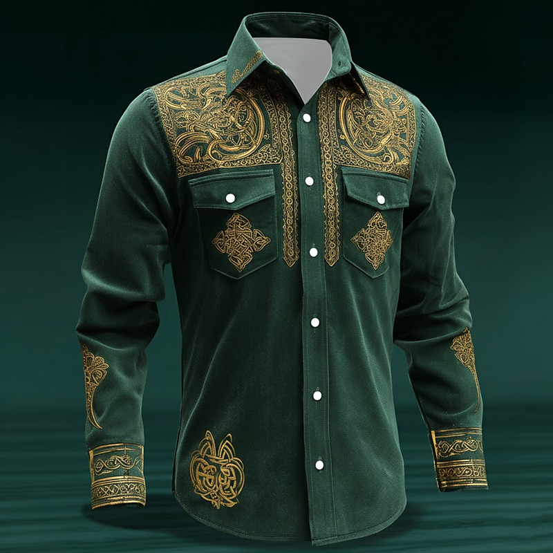 St. Patrick's Day Men's Intricate Floral Celtic Art Shirt Button Up Shirt Long Sleeve Vintage Retro Party Holiday Spring Fall Turndown 3D Print Front Two Pockets Linen Like Shirt Dark Green Green