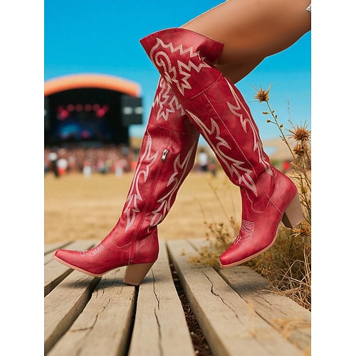 braune Western-Overknee-Stiefel für Damen – bestickte Cowboystiefel aus Kunstleder mit spitzer Zehenpartie und Blockabsatz für Streetstyle, lässige Herbst-Winter-Outfits und den Alltag