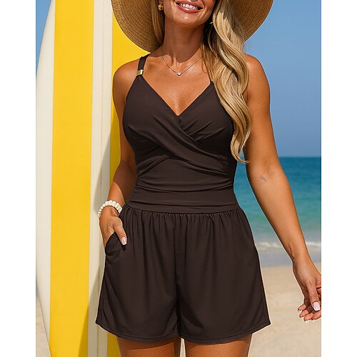 Women's Bikini 2 Piece Swimsuit Ruched Briefs Slim Backless Elegant Vacation Solid Color V Neck Sleeveless Bathing Suits
