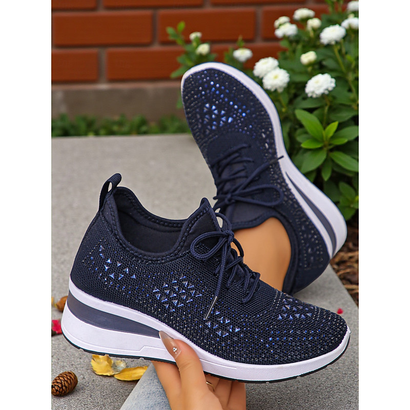 Women's Rose Pink Flyknit Wedge Sneakers with Rhinestone Detailing – Lightweight Breathable Athletic Shoes for Casual Wear and Walking