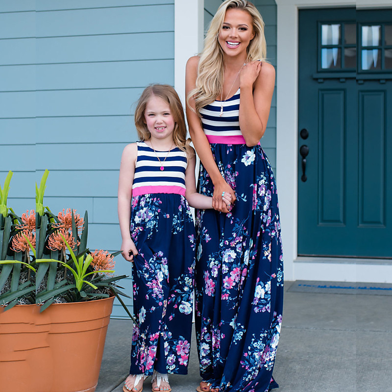 Mommy and Me Dresses Floral Street Patchwork Light Pink Black-1 Black-3 Sleeveless Maxi Tank Dress Active Matching Outfits