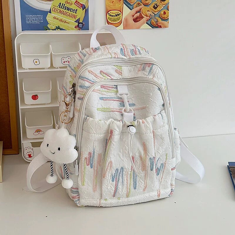 Girls' Pastel Pink Quilted Backpack – Cute Lightweight School Bag with Cloud Keychain and Front Drawstring Pocket