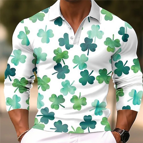 San Patrizio Per uomo Quadrifoglio Giorno di San Patrizio Polo Manica Lunga Magliette polo Collo ripiegato Casual Vacanza Giorno di San Patrizio Ferie Festival 3D Stampato Primavera Estate Bianco
