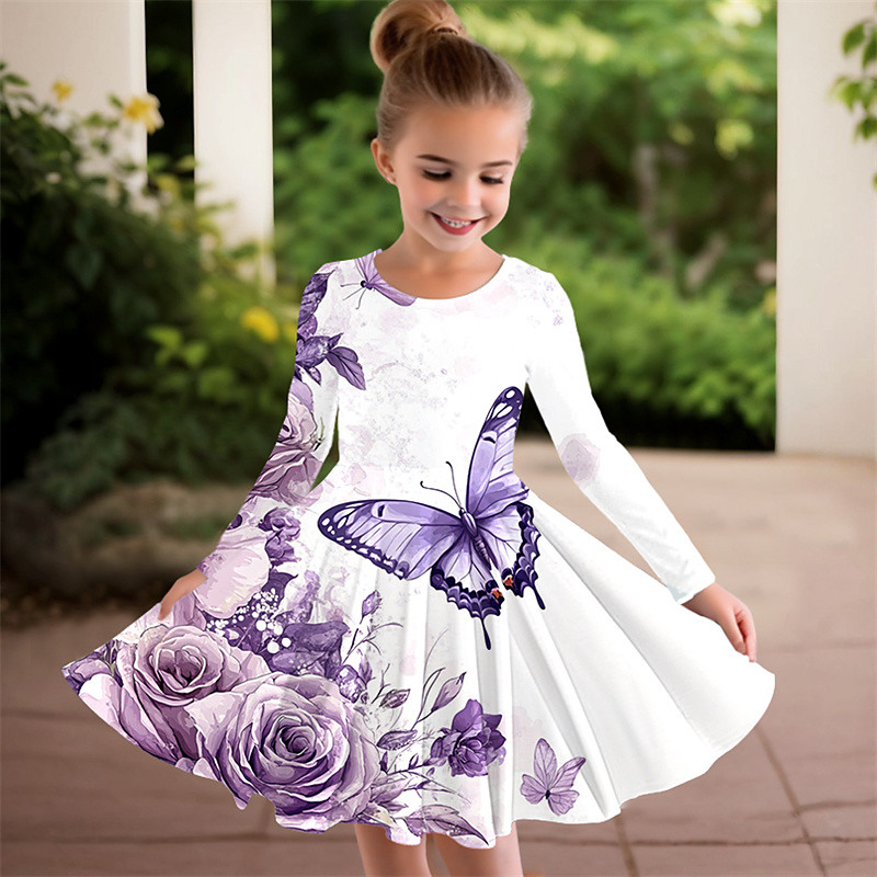 Girls' 3D Butterfly Dress Long Sleeve 3D Print Spring Fall Vacation Sports Outdoor Daily Cute Casual Beautiful Kids 3-12 Years Casual Dress A Line Dress Above Knee Regular Fit