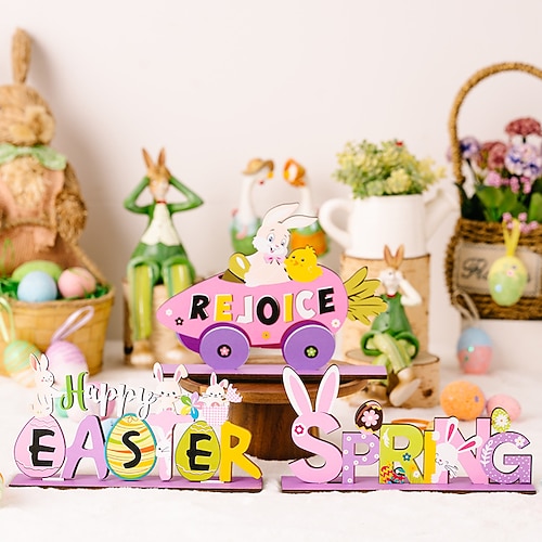 Confezione da 3 decorazioni pasquali, cestini in tessuto non tessuto, statuine di coniglietti pasquali, ornamenti con lettere in legno viola per decorazioni primaverili per la casa, pezzi da