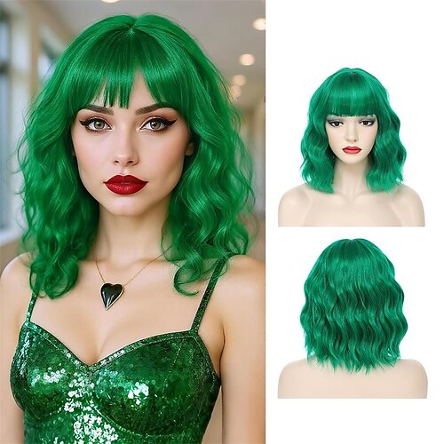 Parrucche Verdi di San Patrizio 2026 Parrucca Sintetica Riccia con Frangia Parrucca Fabbricata a Macchina Corto Capelli Sintetici Verdi per Donne Feste Naturali Verde
