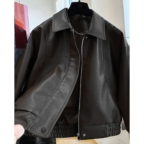 Per donna Giacca in Ecopelle Confortevole Cerniera Tasca Casual Semplice All'aperto Streetwear Abbigliamento quotidiano Uscire Corto Collo ripiegato Vestibilità regolare Manica Lunga Capispalla Cachi