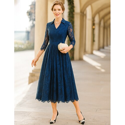 Linea ad A Lunghezza Tè Vestito da Festa Abito da Cocktail Abito da invitata a nozze Abito da cerimonia per signora Manica 3/4 Scollo a V Bavero Elegante Semplice Minimalista Formale Ospite di nozze