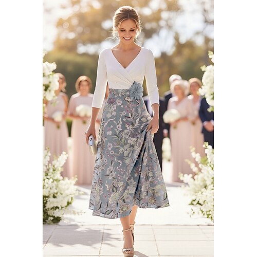 Linea ad A Lunghezza Tè Vestito da Festa Abito da Cocktail Abito da invitata a nozze Abito da cerimonia per signora Manica 3/4 Scollo a V Elegante Formale Serata Formale Ricevimento di matrimonio