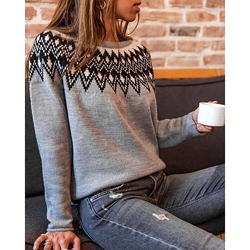 Damen Weihnachtspullover Fair Isle Pullover Pullover Streetwear Lässig Geometrisch Rundhalsausschnitt Gestrickt Druck Langarm Normale Oberteile Stricken Täglich Ferien Ausgehen Rote Braun Herbst