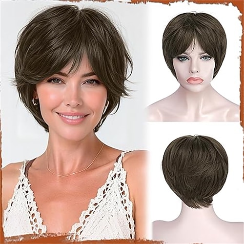 Pixie-Perücke – kurze braune Pixie-Perücke mit Pony, gestufte Kunsthaarperücke für Damen, weich, hitzebeständig, natürlich aussehend, gewellt, für den täglichen Gebrauch und Partys
