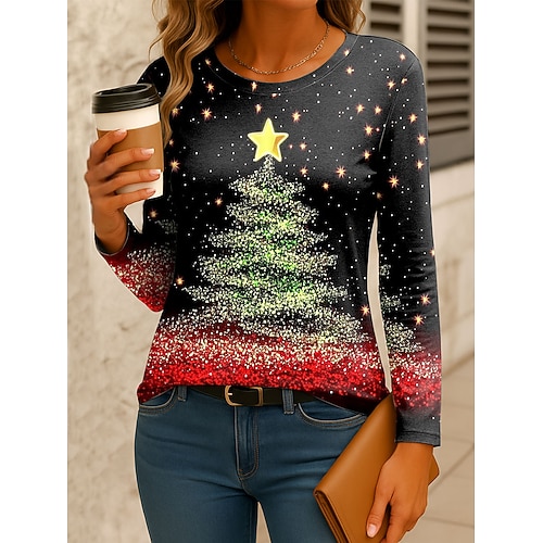 Felicità Natalizia Donne T-Shirt Albero di Natale Fiocco di Neve Grafica Vintage Moda Elegante Maniche Lunghe Collo A Giro Tops Regolari Quotidiano Fine Settimana Stampa Gialla Rosa Rossa Blu Verde