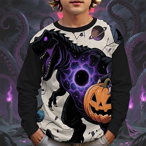Halloween Jungen 3D Cartoon Kürbis Dinosaurier T-Shirt Langarm Frühling Herbst Mode Basic Kinder 4-12 Jahre Rundhalsausschnitt Outdoor Lässig Täglich Normale Passform