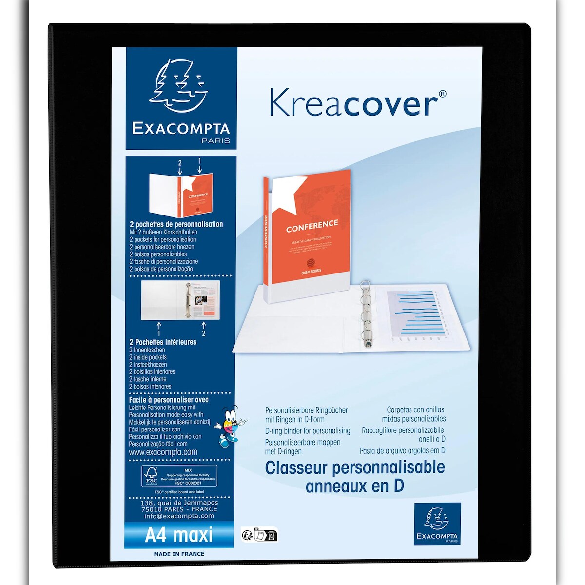 Exacompta 51843NE 10x Ringbuch, 4 Ringe 40mm Rücken 64mm, 3 Außen- und 2 Innenhüllen, 32x28,5cm für DIN A4 MAXI - Kreacover - Schwarz