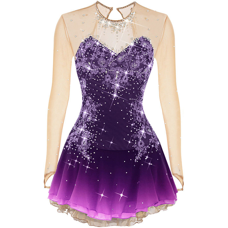 Figure Skating Dress Women's Girls' Ice Skating Dress Yellow Dark Purple Dusty Rose Patchwork Flower Mesh Spandex High Elasticity Competition Skating Wear Handmade Floral Long Sleeve Ice Skating