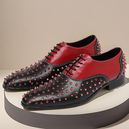 scarpe oxford da uomo nere e rosse con borchie, dettagli punk con rivetti e design con lacci, eleganti scarpe eleganti in pelle per concerti e feste di moda
