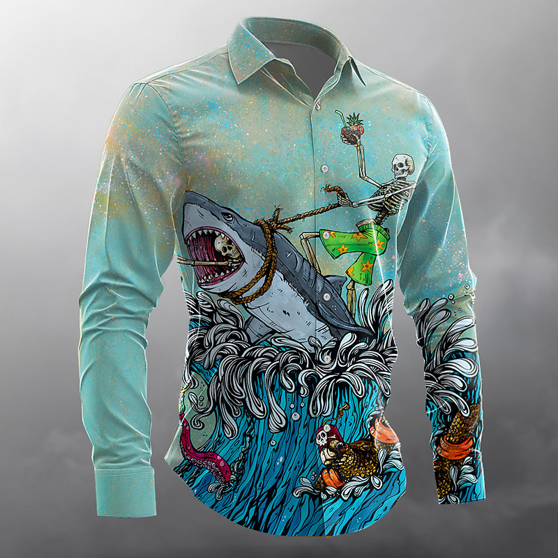 Great White Wave by David Lozeau Men's Skull Shark Button Up Shirt Long Sleeve Designer Shirt Limited Artist Edition