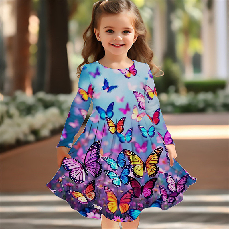 Girls' 3D Graphic Butterfly Dress Long Sleeve 3D Print Summer Spring Fall Vacation Sports Outdoor Daily Cute Casual Beautiful Kids 3-12 Years Casual Dress A Line Dress Above Knee Regular Fit